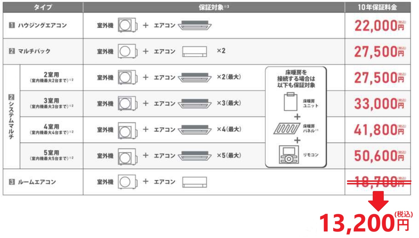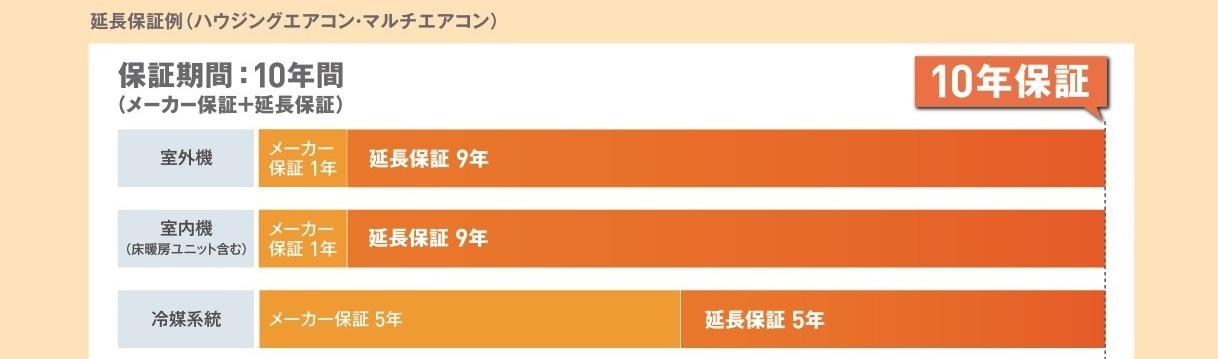 ※1.延長保証サービス規定書に定める対象外項目についての修理・点検は有償となります。施工に起因する故障、または施工に起因する本体以外の商品に生じた故障または損害については保証対象外となります。*本サービスには保証期間内の空調機の洗浄(別途有償)や契約満了時期のご提案などを含みます。