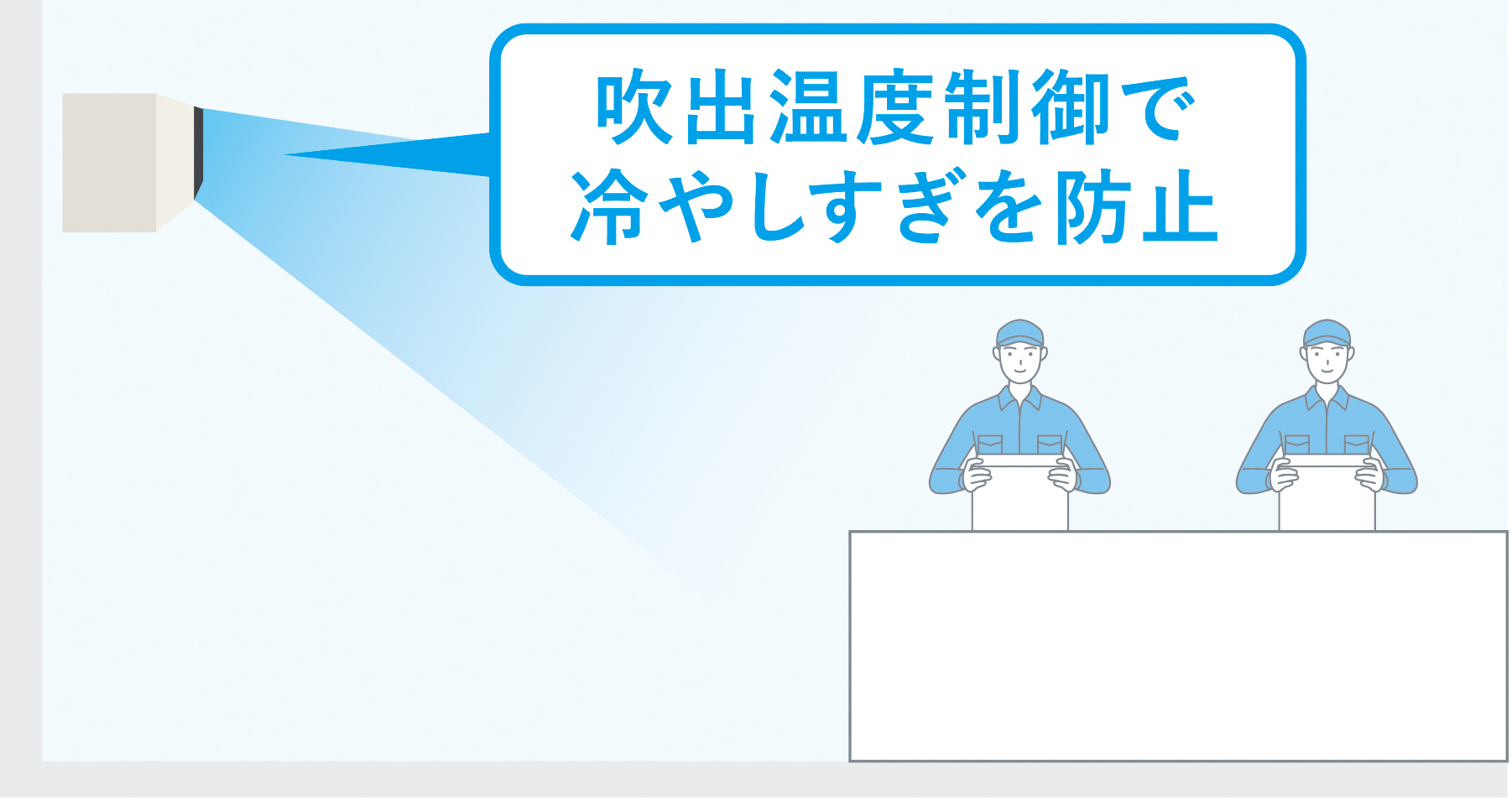 従来の吸込温度制御に加え、吹出温度制御を採用し、作業者が「涼しい」と感じる温度の空気を届けることで、中間期の冷えすぎを抑え、快適性と省エネ性を両立します