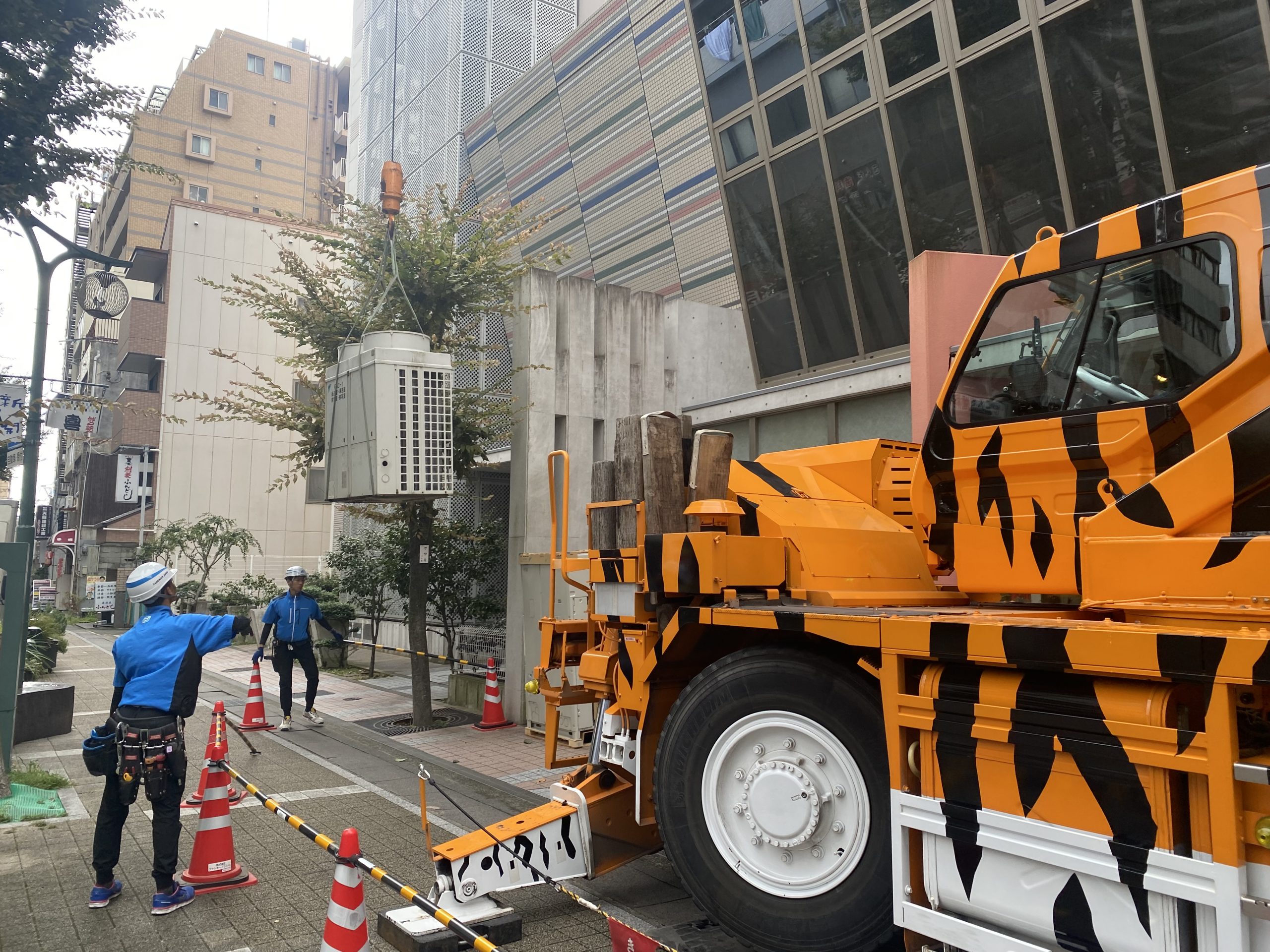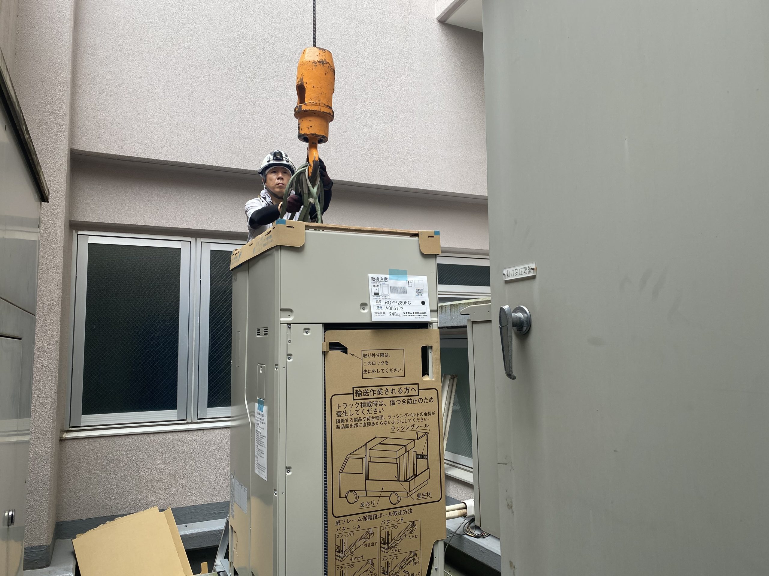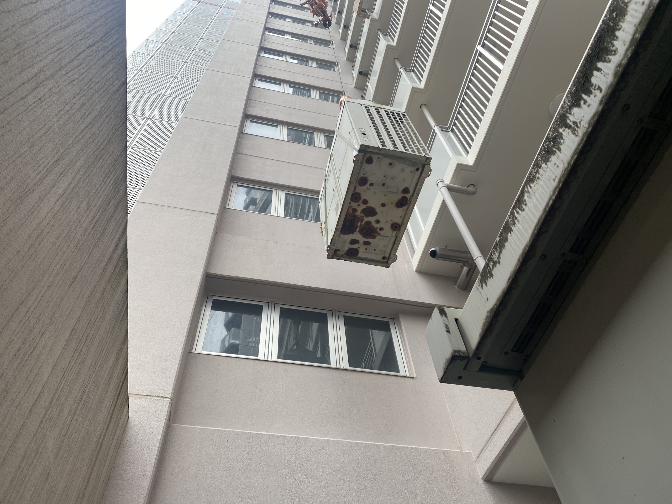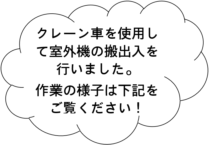 建物の構造上、クレーン車からは室外機の昇降位置を把握することが難しく、現地との密なやりとりが重要でした。