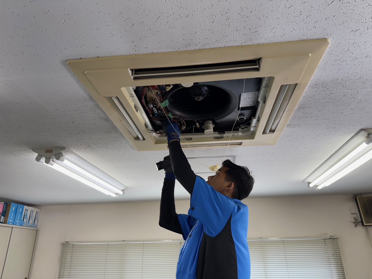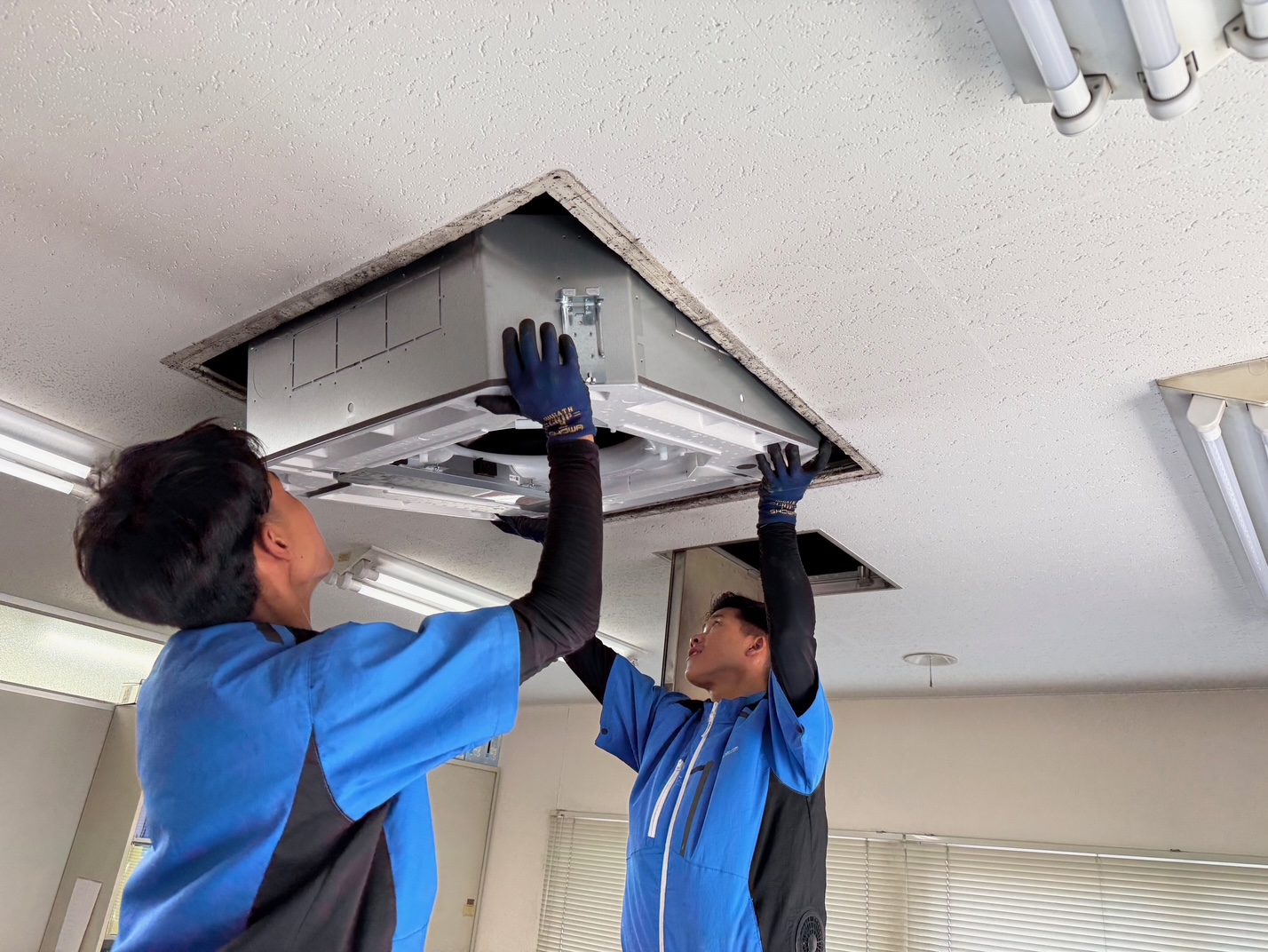 天井埋込カセット形室内機の設置を慎重に続けます。