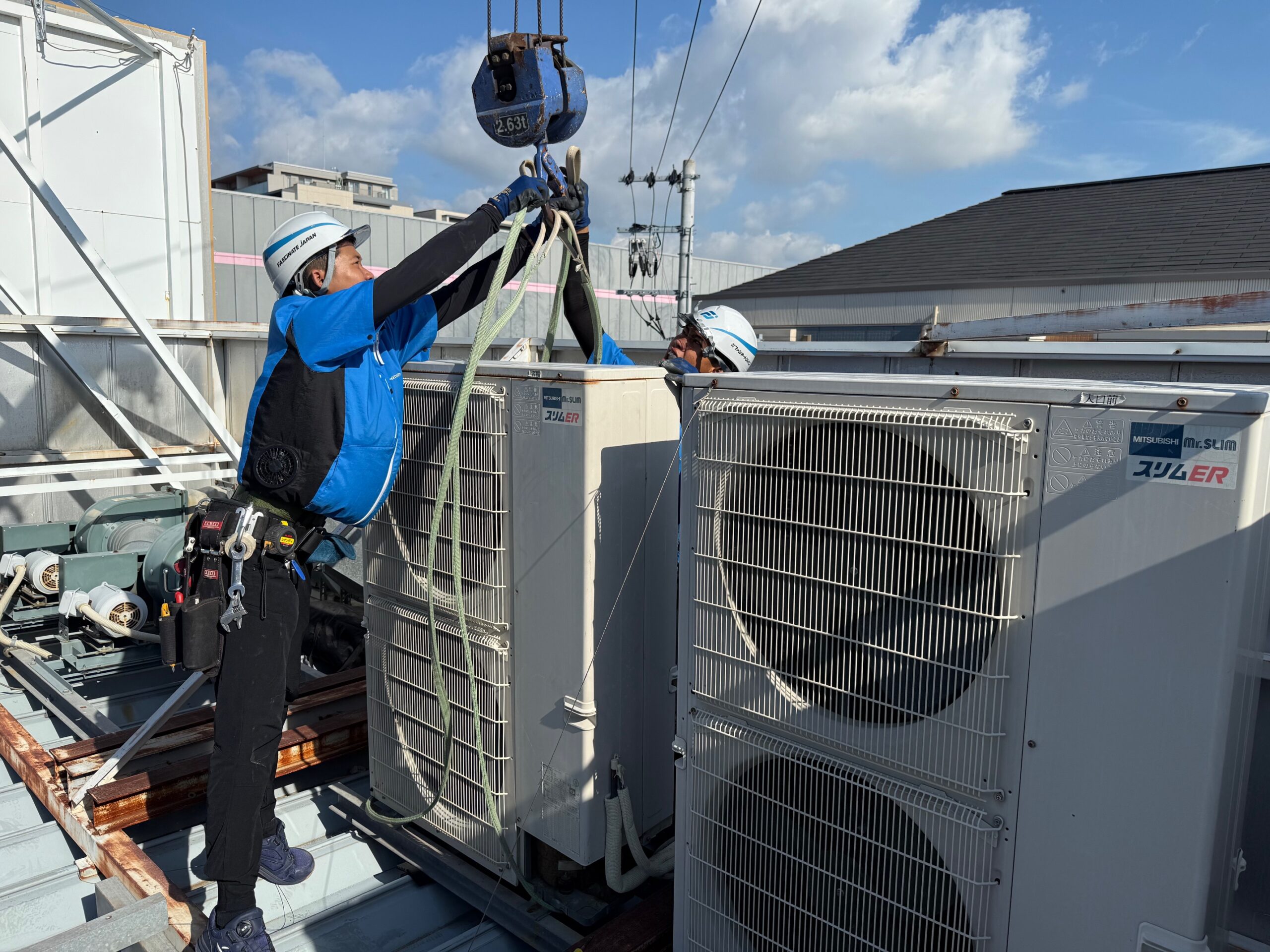 室外機は屋上に設置されているため、ユニック車にて搬出を行いました。高所のため、特に慎重に、安全第一で作業を進めていきます。