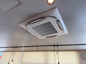 新しいエアコンが無事に設置されました。業務用エアコン「S-ラウンドフロータイプ」は、360°全周の送風が可能。空間全体に均一な気流を届け、快適な空間を実現します。