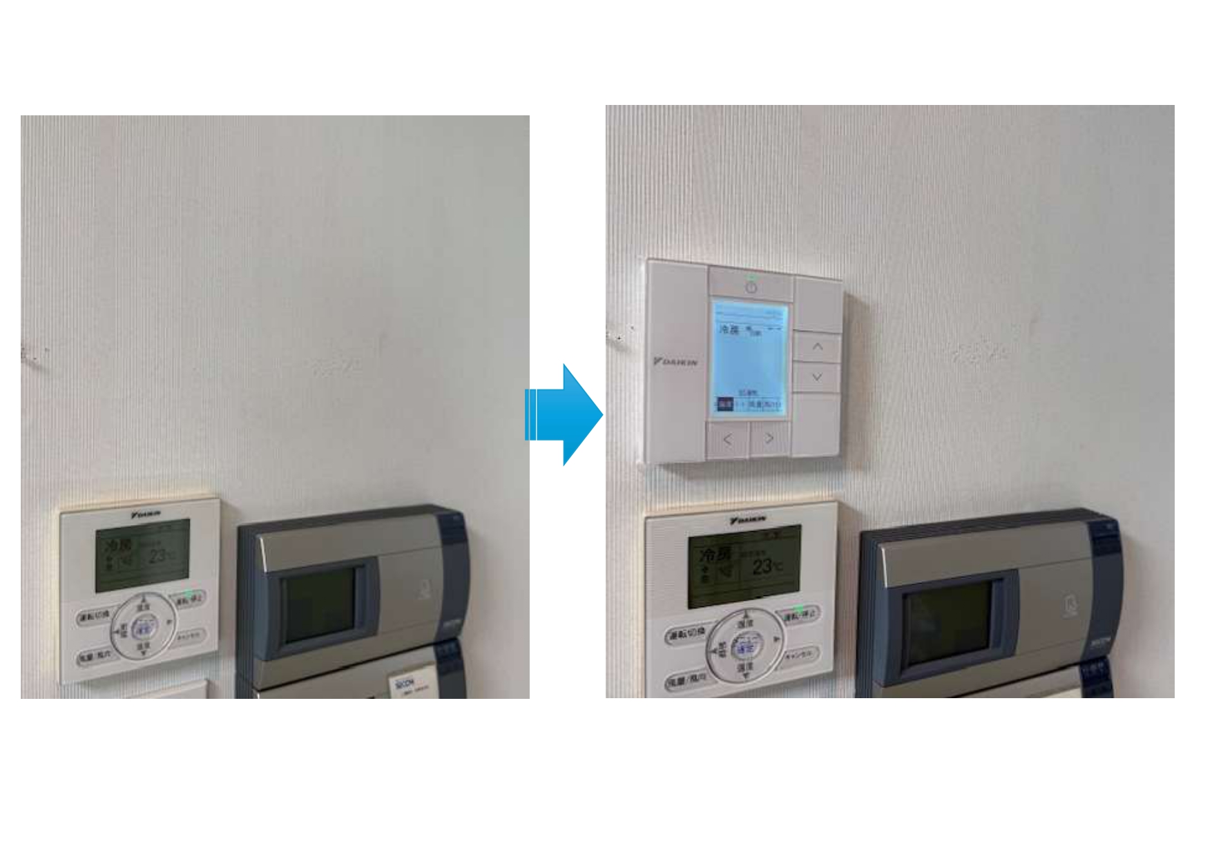 取り替えたエアコン2台のための壁リモコンの増設も行いました。このことにより、2台のエアコンについては、この専用のリモコンで操作が可能となり、より細やかな空調管理が実現しました。