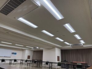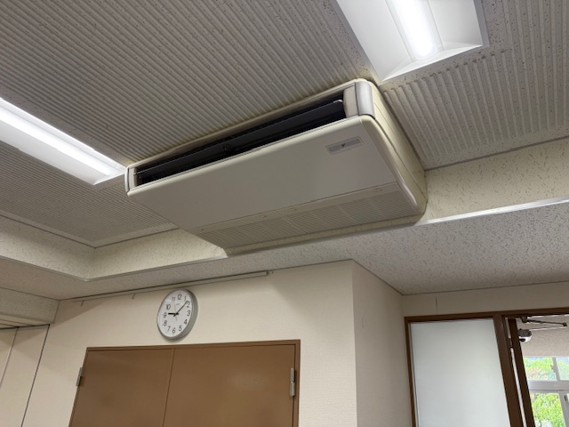 施工場所は地域の方々が集まる集会所。 広い空間で快適な空調を保つために、天井吊型エアコンが使用されています。今回は、既設の天井吊型から新しい天井吊型への取替工事を行いました。![]() |