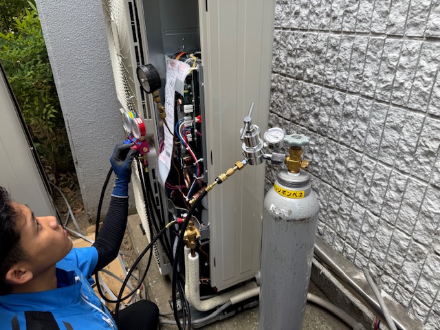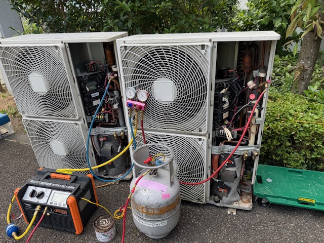 室外機の取外した後、冷媒(フロンガス)を専用の回収機を使用して法令に基づき安全かつ適切に回収を進めていきます。