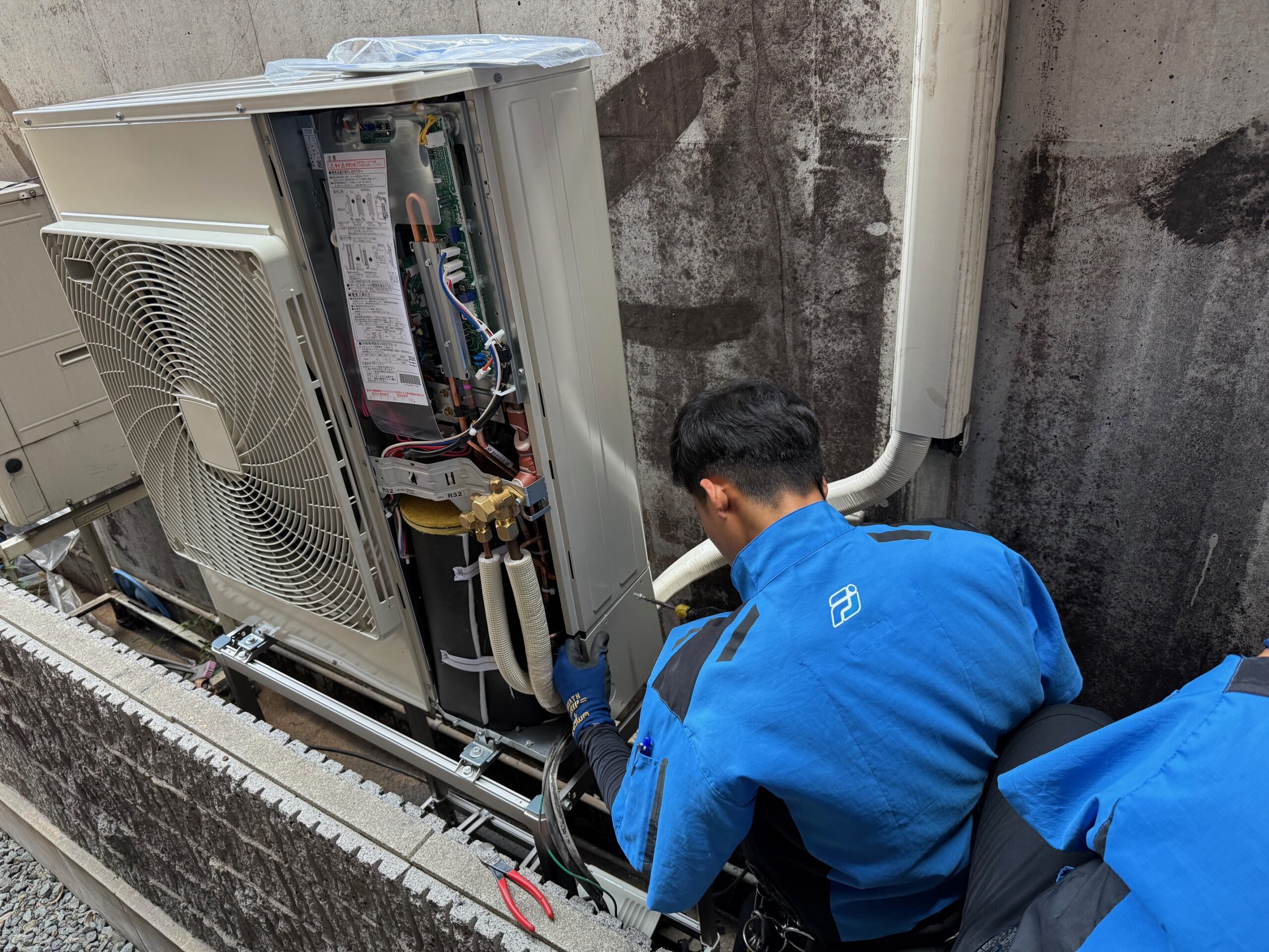 新しい室外機の設置作業