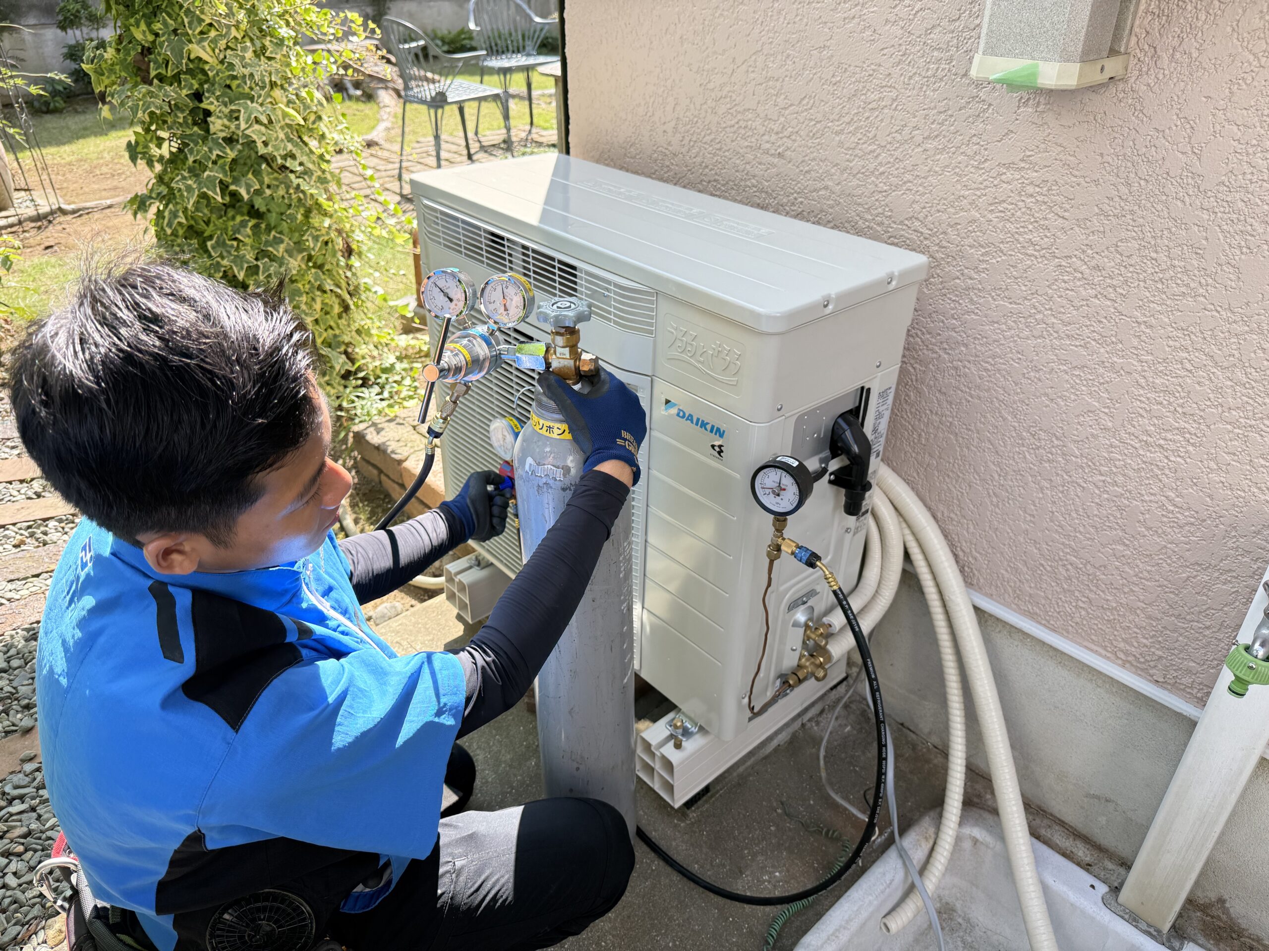 新しい室外機を設置しています。配管を接続後、耐圧試験を実施して漏れがないかの確認をしています。