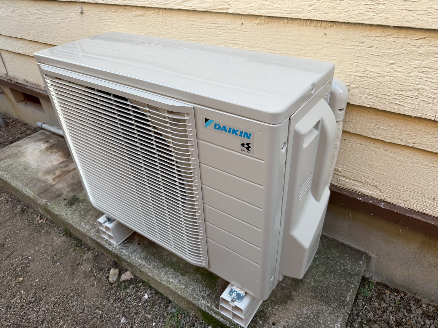 新しい16畳用床置形エアコンの室内機・室外機ともに、無事設置完了。試運転も問題なく、快適な暖房環境が整いました。