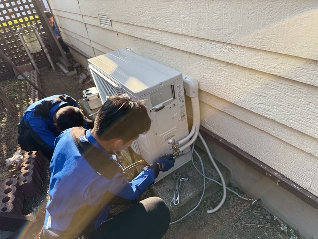 室外機も、今回の工事で撤去作業を行います。冷媒ガスを適切に回収したうえで、配管・電源の接続を慎重に取り外します。