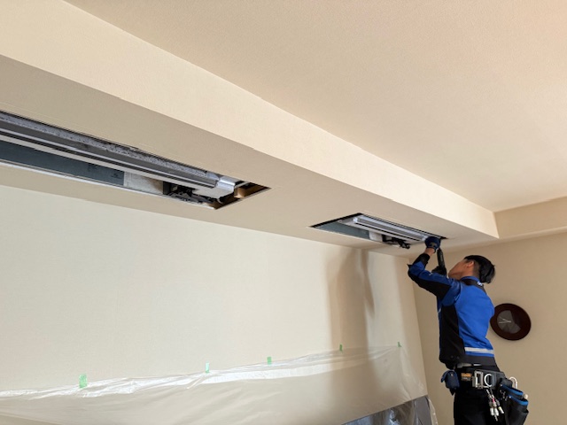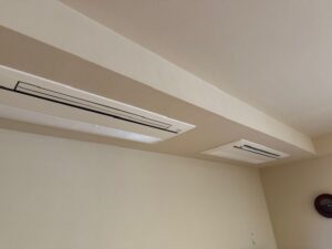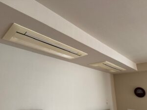 | ご相談内容 | お客様のご自宅では、LDKに埋込型ハウジングエアコンが2台設置されていました。 今回はそのうち1台のみを新しい機種へ交換し、もう1台は取替をせず使用したいとのご希望でした。 天井埋込エアコンは室内の中でも目に入りやすく、 |