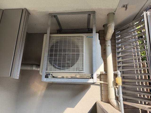 室外機は天吊り架台に設置された業務用エアコンで、重量もあるため、